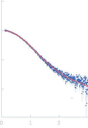 Samples of NS1B-CTD* were prepared at a concentration of 250 μΜ (4 mg/mL) and 1:1 ratio of NS1B-CTD* : 5’ppp ds10 HP RNA in 1K buffer (40 mM ammonium acetate, pH 5.5, 225 mM NaCl, 5 mM CaCl2, 0.02% NaN3, 50 mM arginine) as this lower salt buffer provides a tighter complex. Immediately before mixing the protein with RNA to make the complex, NS1B-CTD* was buffer exchanged into 1K buffer, and concentrated to provide a 250 μΜ complex concentration after adding RNA. RNA was then added to provide a 1:1 NS1B-CTD : 5’ppp ds10 HP RNA ratio. Samples were centrifuged at 8,500 x g for a minimum of 10 mins at the beamline immediately before data collection on the supernatant. SAXS was performed at BioCAT beamline 18ID (Advanced Photon Source, Chicago, IL). Data were collected in a SAXS flow cell which consists of a 1.5 mm ID quartz capillary with 10 µm walls held at 20 oC using 12 keV incident X-rays. Scattering intensity was recorded using a Pilatus3 X 1M (Dectris) detector which was placed 3.44 m from the sample, providing access to a s-range of 0.12 nm-1 to 3 nm-1. During exposure, the sample was flowed through the beam in a single direction, and 0.5 s exposures were acquired every 2 seconds during flow. Data was reduced using BioXTAS RAW 1.4.1. Buffer blanks were created by recording SAXS data from a matched buffer and subtracted from exposures from the sample to create the I(s) vs s curves used for subsequent analyses. All sets of nominally identical measured profiles were automatically compared using CorMap to test for radiation damage or other changes. SAXS data quality assessed by Guinier plot analysis. These data indicated little or no aggregation of the complex under these conditions, consistency between expected and observed molecular weight, low sample radiation damage, and appropriate P(r) calculations.