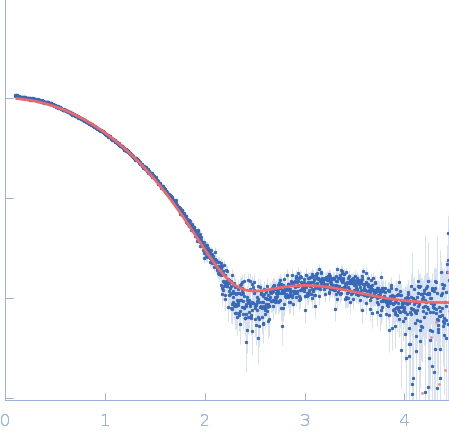 Synchrotron SAXS data from solutions of TuAsV 2A3 in 20mM citrate pH 6.5, 150mM NaCl, 2mM TCEP, 1% glycerol, were collected on the EMBL P12 beam line at PETRA III (DESY; Hamburg, Germany) using a Pilatus 6M detector at a sample-detector distance of 3 m and at a wavelength of λ = 0.124 nm (I(s) vs s, where s = 4πsinθ/λ, and 2θ is the scattering angle). In-line size-exclusion chromatography (SEC) SAS was employed. The SEC parameters were as follows: A 16.00 μl sample at 9.6 mg/ml was injected at a 0.30 ml/min flow rate onto a GE Superdex 75 Increase 5/150 column at 25°C. 33 successive 1 second frames were collected through the SEC elution peak of the sample. The data were normalized to the intensity of the transmitted beam and radially averaged; the scattering of the solvent-blank was subtracted.