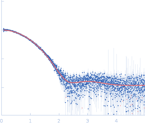 Synchrotron SAXS data from solutions of TuAsV 2A3 in 20 mM HEPES, 150 mM NaCl, 2 mM TECP, 1% glycerol, pH 7.4 were collected on the EMBL P12 beam line at PETRA III (DESY; Hamburg, Germany) using a Pilatus 6M detector at a sample-detector distance of 3 m and at a wavelength of λ = 0.124 nm (I(s) vs s, where s = 4πsinθ/λ, and 2θ is the scattering angle). In-line size-exclusion chromatography (SEC) SAS was employed. The SEC parameters were as follows: A 16.00 μl sample at 9.6 mg/ml was injected at a 0.30 ml/min flow rate onto a GE Superdex 75 Increase 5/150 column at 25°C. 40 successive 1 second frames were collected through the SEC elution peak of the sample. The data were normalized to the intensity of the transmitted beam and radially averaged; the scattering of the solvent-blank was subtracted.