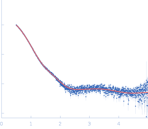 CAUTION: Severe repulsive interparticle interference effects present in the sample result in inaccurate structural parameters (Rg, I(0), MW, Dmax) extracted from the data.