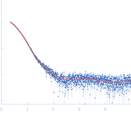 Data set merged from three independent measurements of the same sample. CAUTION: Repulsive interparticle interference effects present in the sample result in inaccurate structural parameters (Rg, I(0), MW, Dmax) extracted from the data.