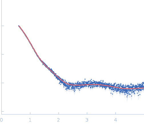 CAUTION: Severe repulsive interparticle interference effects present in the sample result in inaccurate structural parameters (Rg, I(0), MW, Dmax) extracted from the data.