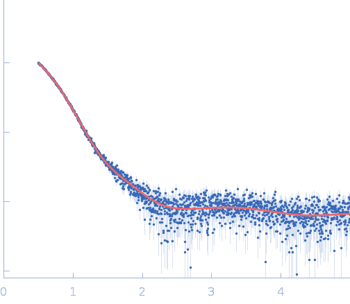 Data set merged from three independent measurements of the same sample. CAUTION: Severe repulsive interparticle interference effects present in the sample result in inaccurate structural parameters (Rg, I(0), MW, Dmax) extracted from the data.