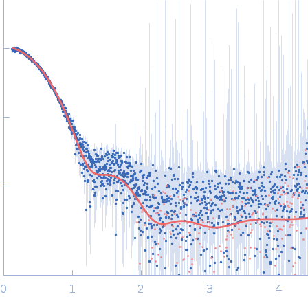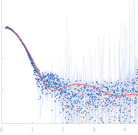 The SEC-SAXS data from the solution of CDIN1 diluted in 20 mM Tris HCl, 150 mM NaCl, 5% glycerol, pH 8.0 buffer were collected on the EMBL P12 beamline at the PETRA III storage ring (DESY; Hamburg, Germany) using a Pilatus 6M detector at a sample-detector distance of 3 m and at a wavelength of λ = 0.123982 nm (I(s) vs s, where s = 4πsinθ/λ, and 2θ is the scattering angle). In-line size-exclusion chromatography (SEC) SAXS was employed. The sample (45 μl at 10 mg/ml) was injected and ran into a GE Superdex 200 Increase 5/150 column at a flow rate of 0.3 ml/min at 20°C. Scattering data were collected throughout the entire SEC column elution with an exposure time of 0.495 sec/frame (for 1200 frames total). The data were normalized to the intensity of the transmitted beam. The selected area of sample elution peak was selected and processed (averaged and buffer subtracted) from 10 data frames using CHROMIXS and primusqt from the ATSAS 3.2.1 package. The radius of gyration (Rg), forward scattering (I(0)), maximum particle dimension (Dmax), and the distance distribution function were determined using primusqt and GNOM. The calculated molecular weight (MW) of CDIN1 is around 67 kDa. MALDI-TOF mass spectrometry suggests a MW 33 369 Da for the CDIN1 monomer. The MW estimation from the SAXS data (primusqt) varied depending on the method used: Qp = 66.3 kDa, MoW = 62.3 kDa, Vc = 66.6 kDa, Size & Shape = 76.6 kDa (Bayesian Inference MW, 62.3 kDa in the 92% credibility interval of 58.8-67.9 kDa). The models displayed in this entry included: Top: The Alphafold2 predicted model of CDIN1 dimer compared with the SAXS data using CRYSOL. Bottom: The Alphafold2 predicted model of CDIN1 monomer compared with the SAXS data using CRYSOL.