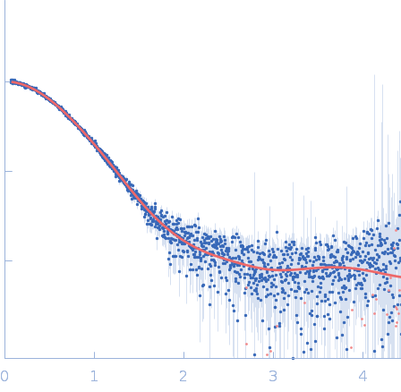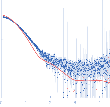 The SEC-SAXS data from the solution of Codanin1 Cterm diluted in 20 mM Tris HCl, 150 mM NaCl, 5% glycerol, pH 8.0 buffer were collected on the EMBL P12 beamline at the PETRA III storage ring (DESY; Hamburg, Germany) using a Pilatus 6M detector at a sample-detector distance of 3 m and at a wavelength of λ = 0.123982 nm (I(s) vs s, where s = 4πsinθ/λ, and 2θ is the scattering angle). In-line size-exclusion chromatography (SEC) SAXS was employed. The sample (45 μl at 10 mg/ml) was injected and ran into a GE Superdex 200 Increase 5/150 column at a flow rate of 0.3 ml/min at 20°C. Scattering data were collected throughout the entire SEC column elution with an exposure time of 0.495 sec/frame (for 1200 frames total). The data were normalized to the intensity of the transmitted beam. The selected area of sample elution peak was selected and processed (averaged and buffer subtracted) from 10 data frames using CHROMIXS and primusqt from the ATSAS 3.2.1 package. The radius of gyration (Rg), forward scattering (I(0)), maximum particle dimension (Dmax), and the distance distribution function were determined using primusqt and GNOM. The calculated molecular weight (MW) of Codanin1 Cterm is around 25 kDa. MALDI-TOF mass spectrometry suggests a MW 24 965 Da for the Codanin1 Cterm monomer. The MW estimation from the SAXS data (primusqt) varied depending on the method used: Qp = 25.9 kDa, MoW = 26.6 kDa, Vc = 27.9 kDa, Size & Shape = 30.9 kDa (Bayesian Inference MW, 28.9 kDa in the 94% credibility interval of 26.6-29.3 kDa). The models displayed in this entry included: Top: The Alphafold2 predicted model of Codanin1 Cterm monomer compared with the SAXS data using CRYSOL. Bottom: The Alphafold2 predicted model of Codanin1 Cterm dimer compared with the SAXS data using CRYSOL.