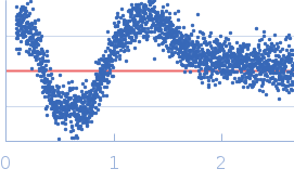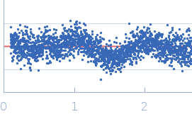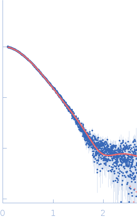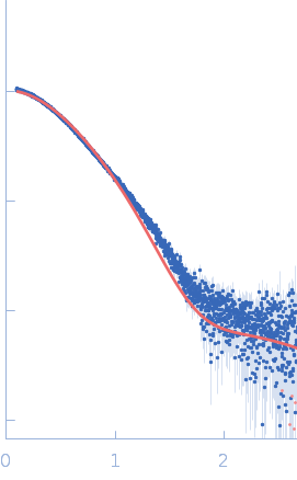 Molecular weight has been inferred through Volume of Correlation (Vc). Sample molecular weight and monodispersity has been independently confirmed through static light scattering (SLS). 34 successive frames were collected through the sample elution peak (from a total of 600 frames). |