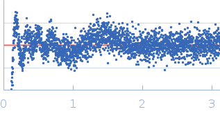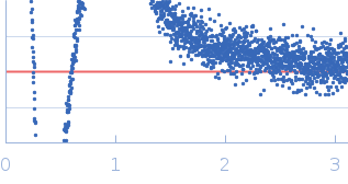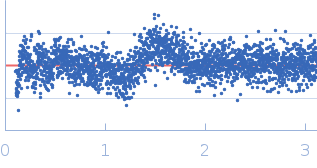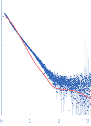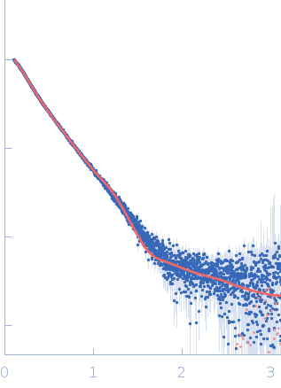 Molecular weight has been inferred through Volume of Correlation (Vc). Sample molecular weight and monodispersity has been independently confirmed through static light scattering (SLS). 30 successive frames were collected through the sample elution peak (from a total of 600 frames). |