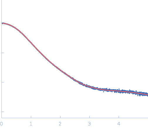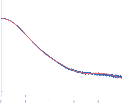 Synchrotron SAXS data from solutions of Class V GTP aptamer complex with GTP in 50 mM Bis-Tris, 50 mM KCl, 2 mM MgCl2, pH 6.5 were collected on the EMBL P12 beam line at PETRA III (DESY; Hamburg, Germany) using a Pilatus 6M detector at a sample-detector distance of 3 m and at a wavelength of λ = 0.123985 nm (I(s) vs s, where s = 4πsinθ/λ, and 2θ is the scattering angle). One solute concentration of 6.00 mg/ml was measured at 20°C. 40 successive 0.095 second frames were collected. The data were normalized to the intensity of the transmitted beam and radially averaged; the scattering of the solvent-blank was subtracted.