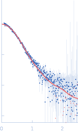 Synchrotron SAXS data from solutions of Ratiometric matryoshka biosensor for Fe2+ (MDtxRGA_G149) in 20 mM MOPS, 250 mM KCl, pH 7 were collected on the BM29 beam line at the ESRF (Grenoble, France) using a Pilatus3 2M detector at a sample-detector distance of 2.8 m and at a wavelength of λ = 0.099 nm (I(s) vs s, where s = 4πsinθ/λ, and 2θ is the scattering angle). In-line size-exclusion chromatography (SEC) SAS was employed. The SEC parameters were as follows: A 100.00 μl sample at 4 mg/ml was injected at a 0.60 ml/min flow rate onto a GE Superdex 200 Increase 10/300 column at 20°C. 1200 successive 2 second frames were collected. The data were normalized to the intensity of the transmitted beam and radially averaged; the scattering of the solvent-blank was subtracted.