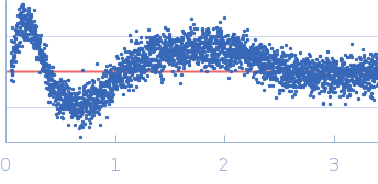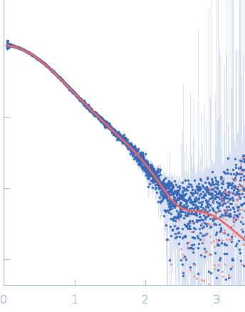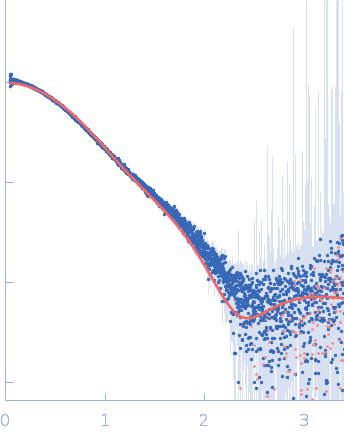 Synchrotron SAXS data from solutions of Frataxin bound to tailored nanobody 16C10 in 20 mM Tris, 150 mM NaCl, pH 7.5 were collected on the B21 beam line at the Diamond Light Source (Didcot, UK) using a Eiger 4M detector at a sample-detector distance of 3.7 m and at a wavelength of λ = 0.1 nm (I(s) vs s, where s = 4πsinθ/λ, and 2θ is the scattering angle). One solute concentration of 7.00 mg/ml was measured at 18°C. 600 successive 3 second frames were collected. The data were normalized to the intensity of the transmitted beam and radially averaged; the scattering of the solvent-blank was subtracted.