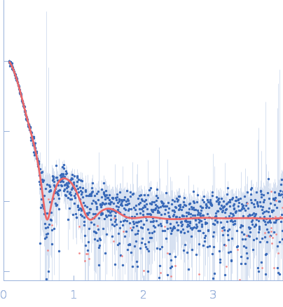 Synchrotron SAXS data from solutions of horse spleen apoferritin in 137 mM NaCl, 2.7 mM KCl, 10 mM phosphate buffer, 0.9 mM CaCl2, 0.5 mM MgCl2, pH 7.4 were collected on the BL19U2 beam line at the Shanghai Synchrotron Radiation Facility (SSRF; Shanghai, China) using a Pilatus 1M detector at a sample-detector distance of 2.7 m and at a wavelength of λ = 0.1033 nm (I(s) vs s, where s = 4πsinθ/λ, and 2θ is the scattering angle). In-line size-exclusion chromatography (SEC) SAS was employed. The SEC parameters were as follows: A 80.00 μl sample at 2.1 mg/ml was injected at a 0.50 ml/min flow rate onto a GE Superose 6 Increase 10/300 column at 20°C. 40 successive 1 second frames were collected. The data were normalized to the intensity of the transmitted beam and radially averaged; the scattering of the solvent-blank was subtracted.
