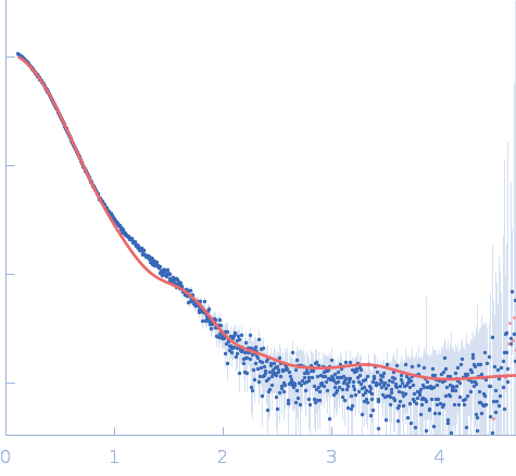 The trace was processed with Chromixs. The IFT was computed in BioXtas-RAW 2.3.0. The Dmax was set to 162 Angstroms. GNOM gives a similar Dmax at a qmax of 0.3 A^-1. |