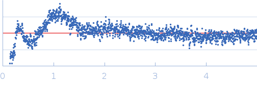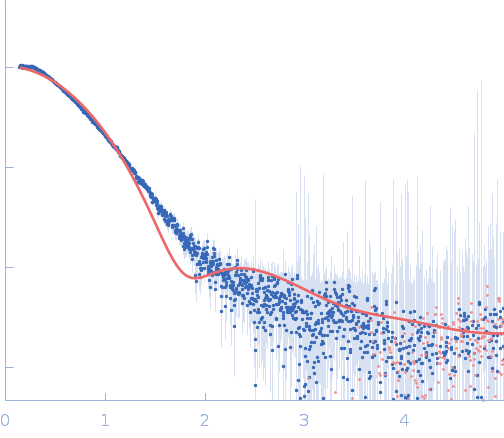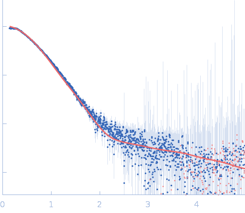 Synchrotron SAXS data from solutions of the N-terminal domain of relaxase in complex with nic sequence DNA in 20 mM Tris, 300 mM NaCl, 1 mM DTT, pH 8 were collected on the BL11-NCD beam line at ALBA (Cerdanyola del Vallès, Barcelona, Spain) using a ADSC Quantum 210r detector at a sample-detector distance of 2.6 m and at a wavelength of λ = 0.1 nm (I(s) vs s, where s = 4πsinθ/λ, and 2θ is the scattering angle). One solute concentration of 5.00 mg/ml was measured at 25°C. 20 successive 0.100 second frames were collected. The data were normalized to the intensity of the transmitted beam and radially averaged; the scattering of the solvent-blank was subtracted.
