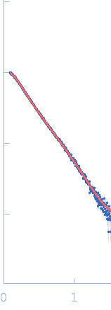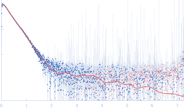 Synchrotron SAXS data from solutions of G3BP1 in 50mM MES pH 6, 150mM NaCl, 1mM DTT, 1% glycerol, were collected on the EMBL P12 beam line at PETRA III (DESY; Hamburg, Germany) using a Pilatus 6M detector at a sample-detector distance of 3 m and at a wavelength of λ = 0.124 nm (I(s) vs s, where s = 4πsinθ/λ, and 2θ is the scattering angle). In-line size-exclusion chromatography (SEC) SAS was employed. The SEC parameters were as follows: A 60.00 μl sample at 8.5 mg/ml was injected at a 0.75 ml/min flow rate onto a GE Superdex 200 Increase 5/150 column at 25°C. 22 successive 1 second frames were collected through the SEC elution peak of the sample. The data were normalized to the intensity of the transmitted beam and radially averaged; the scattering of the solvent-blank was subtracted. |